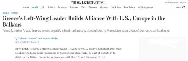 Όπως αναφέρει η δημοσιογράφος της WSJ, «ο κ. Τσίπρας, ο 44χρονος ηγέτης ενός ελληνικού αριστερού κόμματος, που ήταν κάποτε αντίθετος με την αμερικανική εξουσία και το ΝΑΤΟ, οδήγησε σε μια ανεπιτυχή εξέγερση ενάντια στις αυστηρές οικονομικές πολιτικές της ΕΕ το 2015, όταν η Ελλάδα λίγο έλειψε να βγει από το ευρώ». Και συνεχίζει: «Τώρα ο κ. Τσίπρας, που θεωρείται από τις ΗΠΑ και την ΕΕ ως ένας όλο και πιο μετριοπαθής παίκτης, λέει ότι θέλει η Ελλάδα να στηρίξει τις προσπάθειες της Δύσης στα Βαλκάνια».