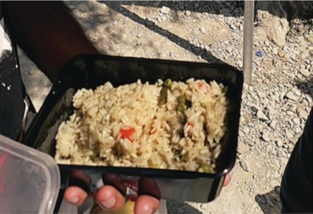 Νερό και ένα πλαστικό πιάτο με ρύζι που όμως τις περισσότερες φορές δεν τρώγεται όπως καταγγέλλουν οι πρόσφυγες στο βίντεο. «Είναι σαν να τρως πλαστικό» τονίζουν.