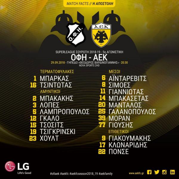 Η απουσία του αμυντικού μέσου Άλεφ ήταν δεδομένη από τη στιγμή που δεν προπονήθηκε την Πέμπτη (27/9), ωστόσο στην αποστολή της ΑΕΚ για το παιχνίδι με τον ΟΦΗ στο «Γεντί Κουλέ» το Σάββατο 29/9 (20:30) δεν συμπεριλήφθηκαν και δύο βασικότατοι παίκτες: ο Μάρκο Λιβάγια και ο Μάριος Οικονόμου.