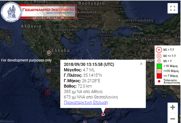 Σεισμός μεγέθους 4,7 βαθμών Ρίχτερ έπληξε την Κρήτη, λίγο μετά τις 16:00, σύμφωνα με ανακοίνωση του Γεωδυναμικού Ινστιτούτου