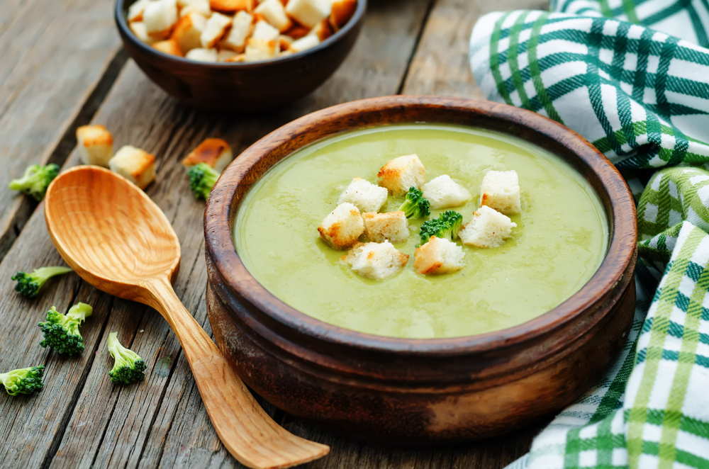 1 κιλό μπρόκολο, σε μπουκετάκια 3 κ.σ. βούτυρο 3 κ.σ. έ.π. ελαιόλαδο 4 πατάτες, μέτριες, σε μεγάλα κομμάτια 4 καρότα, σε μεγάλα κομμάτια 4 πράσα, σε μεγάλα κομμάτια 2 κρεμμύδια, ξερά, σε μεγάλα κομμάτια 80 ml λευκό ξηρό κρασί 800 ml ζωμό λαχανικών (σπιτικό ή ψυγείου, ή από βιολογικό κύβο) 3 κ.σ. μπαχαρικά (καρδάμωμο, μοσχοκάρυδο, γλυκιά πάπρικα) ξύσμα από 2 λεμόνια, ακέρωτα γιαούρτι, στραγγιστό, για το σερβίρισμα (προαιρετικά) ή μερικές φέτες προσούτο Ευρυτανίας και μερικά κρουτόν αλάτι και πιπέρι