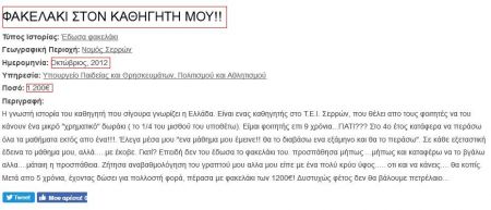 Απόσπασμα από την ανάρτηση –σε site καταγγελιών για υποθέσεις διαφθοράς- από τον Οκτώβριο του 2012 σπουδαστή σχολής ΤΕΙ στις Σέρρες, σχετικά με τη δράση καθηγητή που συνελήφθη προ δύο ημερών από την Υπηρεσία Εσωτερικών Υποθέσεων της ΕΛ.ΑΣ για δωροληψία και άλλα αδικήματα. Ο καθηγητής φαίνεται, τουλάχιστον την τελευταία οκταετία, να απαιτούσε σχεδόν απ όλους τους σπουδαστές του «μίζα» εκατοντάδων ευρώ για να μην τους κρίνει αποτυχόντες στις εξετάσεις. Με το δεδομένο ότι στο κάθε έτος της εν λόγω σχολής σπουδάζουν περίπου 200 άτομα , και ο καθηγητής τα τελευταία χρόνια δίδασκε 6-8 μαθήματα τα κέρδη του υπολογίζονται από την ΕΛ.ΑΣ ότι μπορεί να υπερβαίνουν τα 800.000 έως 1.000.000 ευρώ. Μαζί με τον καθηγητή του ΤΕΙ συνελήφθησαν και ένας ιδιοκτήτης τοπικού φροντιστηρίου και η σύζυγός του, γιατί φέρεται –σύμφωνα με την ΕΛ.ΑΣ- να λειτουργούσαν ως «εισπράκτορές» του ενώ διαπιστώθηκε ότι είχαν καταθέσεις άνω των 150.000 ευρώ στη γερμανική τράπεζα Deutsche Bank. Επιπλέον βρέθηκαν 15 τραπεζικά βιβλιάρια.