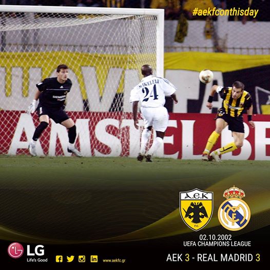 «Μια από τις κορυφαίες εμφανίσεις ελληνικού συλλόγου στη φάση των ομίλων του UEFA Champions League σαν σήμερα, πριν από 16 χρόνια. Στις 2 Οκτωβρίου του 2002, η ΑΕΚ του Ντούσαν Μπάγεβιτς παίζει στα ίσα και… κάτι παραπάνω την Ρεάλ Μαδρίτης του Ζινεντίν Ζιντάν και των άλλων αστέρων στο «Νίκος Γκούμας», προηγείται με 3-1 χάρη σε τέρματα των Τσιάρτα, Μαλαδένη, Νικολαΐδη και το τελικό 3-3 κολακεύει περισσότερο τους «Μερένχες» παρά τους Κιτρινόμαυρους, στο τελευταίο πολύ μεγάλο ευρωπαϊκό βράδυ της Ένωσης στον Ναό της μέχρι το επόμενο…»