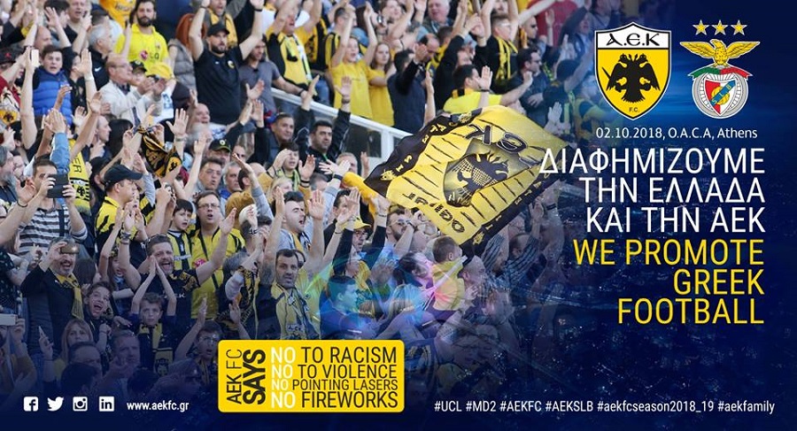 Η ΑΕΚ επιστρέφει σε εντός έδρας βραδιές Champions League, ύστερα από 12 χρόνια και η ΠΑΕ εξέδωσε ανακοίνωση λίγες ώρες πριν από την αναμέτρηση με την Μπενφίκα στο ΟΑΚΑ (2/10, 22:00, Cosmote Sport 2) ζητώντας από τον κόσμο να διαφημίσει και να προστατεύσει το σύλλογο, αλλά και να στηρίξει με υπομονή τους παίκτες.