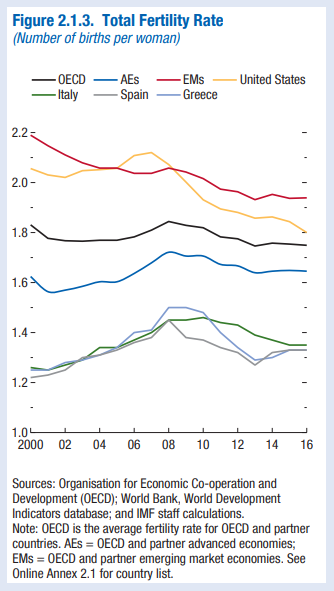 Το ΔΝΤ διαπιστώνει ότι «τη δεκαετία πριν από την κρίση, ο συνολικός δείκτης γονιμότητας αυξήθηκε σε πολλές ανεπτυγμένες οικονομίες, για να υποχωρήσει αργότερα», κυρίως εξαιτίας της εκτίναξης της ανεργίας που προκάλεσε η κρίση.