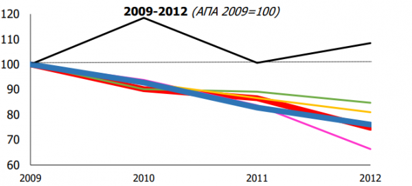 Στην πρώτη περίοδο της κρίσης (2009-2012), ο τουριστικός τομέας παρουσίασε σημαντικές απώλειες ΑΠΑ της τάξης του 25%, δηλαδή, περισσότερο από την υπόλοιπη οικονομία (-20%), μειώνοντας έτσι το μερίδιό του σε αυτήν από 7,2% σε 6,7%.