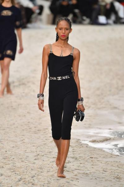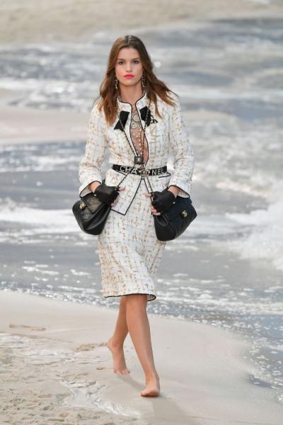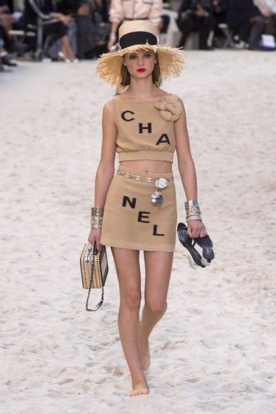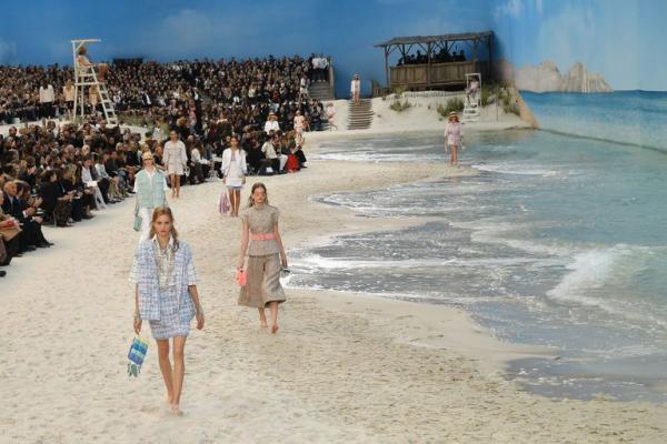 Οι προσκεκλημένοι έκατσαν σε καθίσματα και όχι σε σεζ λονγκ και η «παραλία» ξεκίνησε να υποδέχεται τα μοντέλα με τις νέες δημιουργίες του οίκου. Το σκηνικό ήταν τέλειο και παραμυθένιο, αλλά περίμενε κανείς κάτι λιγότερο από τον οίκο Chanel; Άλλες φορές μέσα σε δάσος, άλλες μέσα σε ένα σούπερ μάρκετ, ο Λάγκερφελντ έχει κάνει φανερό ότι δεν είναι ευχαριστημένος με κάτι λιγότερο από το τέλειο το πιο φανταζί. Από δροσερό σε αστικό, το σκηνικό άλλαξε άρδην και τα ξυπόλητα μοντέλα βάδιζαν με βήμα νωχελικό στην άκρη των κυμάτων.