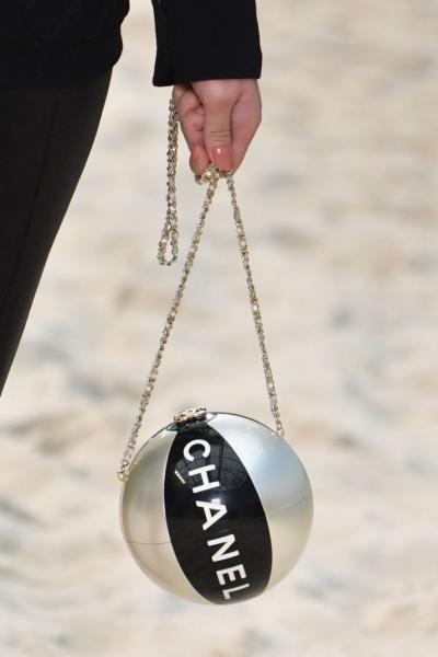 Στα αξεσουάρ, διπλές τσάντες κάνουν χιαστί συνδυασμούς πάνω στα μοντέλα και η logomania σε κάθε εμφάνιση έφερνε έναν αέρα από τα παλιά – κακά 90’s. Τα σκουλαρίκια, οι τσάντες και οι ζώνες με αλυσίδες φούστας, που έγραφαν το όνομα του εμπορικού σήματος είναι πια χωρισμένα σε δύο μέρη: «CHA» και «NEL». Τα παπούτσια είχαν έναν δευτερεύοντα ρόλο καθώς ο Λάγκερφελντ άφησε τα μοντέλα να περπατούν ξυπόλητα μέσα από την άμμο, κρατώντας τα παπούτσια τους, συνήθως ζευγάρια με χαμηλό τακούνι διαφανές. Η Κάια Γκέμπερ ήταν «ζωσμένη» με το εμπορικό σήμα σε τρία μέρη, από τη ζώνη της μέσης, στις τσέπες της και τα σκουλαρίκια της. Για όποιον μάλλον δεν κατάλαβε από πού ήταν ντυμμένη!
