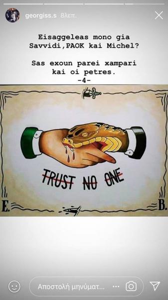 Σχολίασε μάλιστα από κάτω «σας έχουν πάρει χαμπάρι και οι πέτρες» και ακολούθως εμφάνισε τη φωτογραφία μίας χειραψίας με το ένα χέρι να μετατρέπεται σε φίδι που δαγκώνει το άλλο. Εκεί υπήρχε και το μήνυμα «μην εμπιστεύεσαι κανέναν».