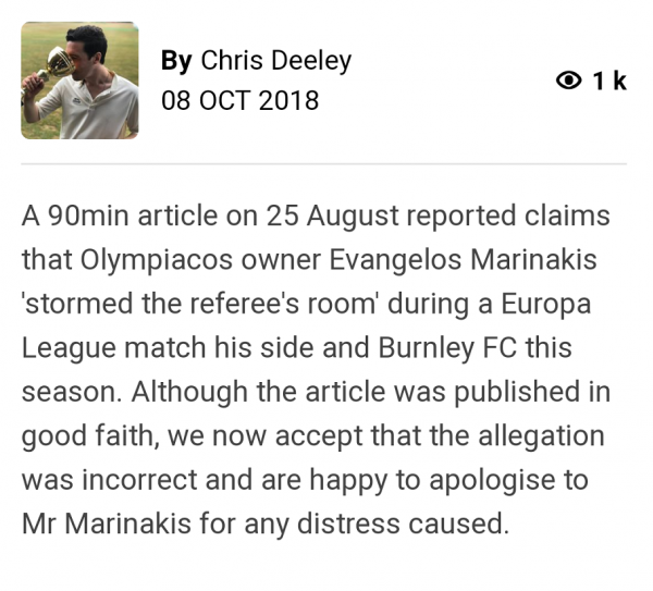 «Ένα άρθρο του 90min στις 25 Αυγούστου υποστήριζε ότι ο ιδιοκτήτης του Ολυμπιακού Ευάγγελος Μαρινάκης μπήκε στα αποδυτήρια των διαιτητών στον αγώνα του Ολυμπιακού με την Μπέρνλι για το Γιουρόπα Λιγκ. Παρά το ότι δημοσιεύτηκε με καλή πίστη, τώρα αποδεχόμαστε ότι ο ισχυρισμός ήταν αναληθής και ζητάμε συγγνώμη από τον κύριο Μαρινάκη για όποια δυσφορία προκλήθηκε», αναφέρει χαρακτηριστικά η αγγλική ιστοσελίδα, παραδεχόμενη ότι τα γραφόμενα δεν ανταποκρίνονταν στην πραγματικότητα.
