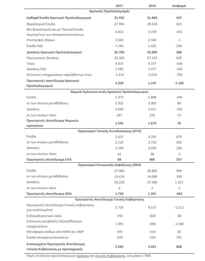 Το ενοποιημένο πρωτογενές αποτέλεσμα γενικής κυβέρνησης το οκτάμηνο Ιανουαρίου – Αυγούστου του 2018 εμφανίζεται βελτιωμένο κατά 868 εκατ. ευρώ σε σχέση με το αντίστοιχο οκτάμηνο του προηγούμενου έτους, σύμφωνα με την εκτίμηση του Γραφείου Προϋπολογισμού του Κράτους στη Βουλή