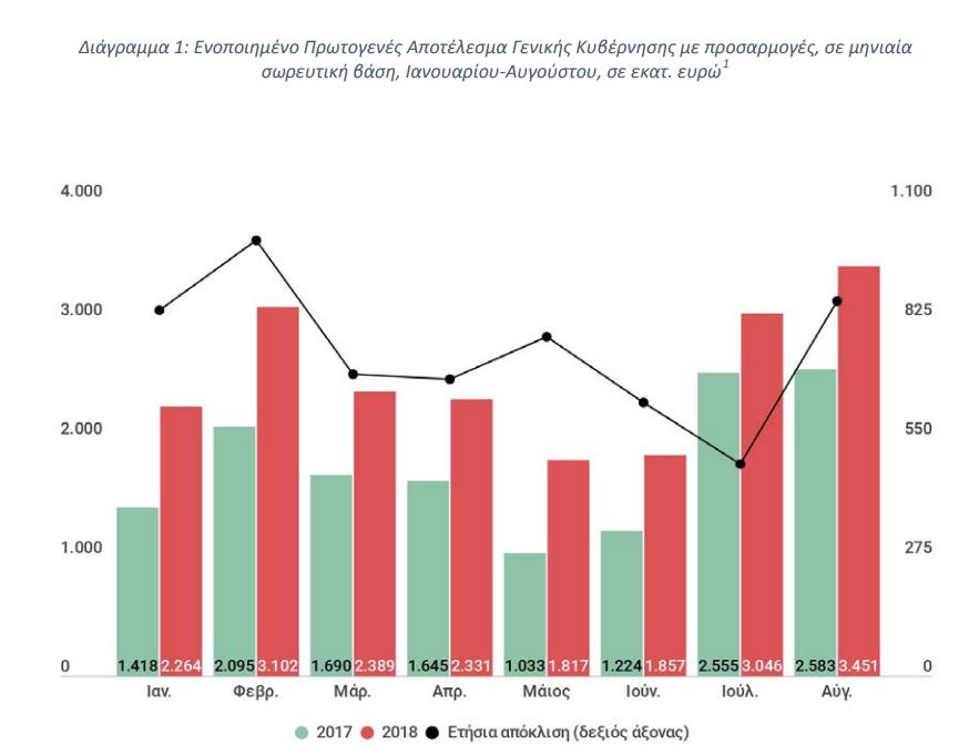 Βελτιωμένο κατά 868 εκατ. ευρώ, έναντι του αντίστοιχου διαστήματος πέρυσι, εμφανίζεται το ενοποιημένο πρωτογενές αποτέλεσμα γενικής κυβέρνησης (δεν ταυτίζεται αλλά είναι κοντά σε αυτό που μετρούν οι δανειστές) το οκτάμηνο Ιανουάριος – Αύγουστος 2018, σύμφωνα με τις εκτιμήσεις του Γραφείου Προϋπολογισμού του Κράτους στη Βουλή, γεγονός που ενισχύει την άποψη ότι ο δημοσιονομικός στόχος όχι μόνο θα επιτευχθεί αλλά θα ξεπεραστεί όπως προβλέπει η κυβέρνηση.