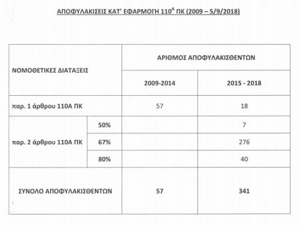 – Οι αποφυλακίσεις για λόγους αναπηρίας την τριετία 2015 – 18 είναι 341 (εξ αυτών οι 323 είναι με το νόμο Παρασκευόπουλου) όταν την 5ετία 2009 – 14 ήταν μόλις 57.