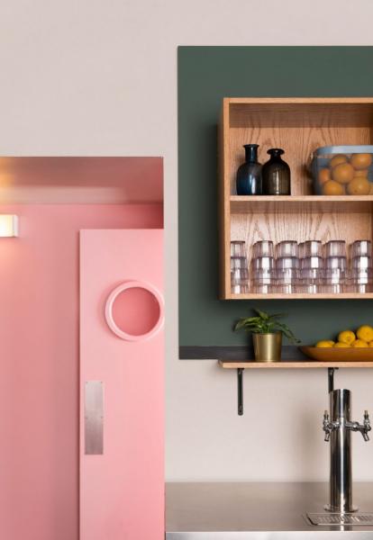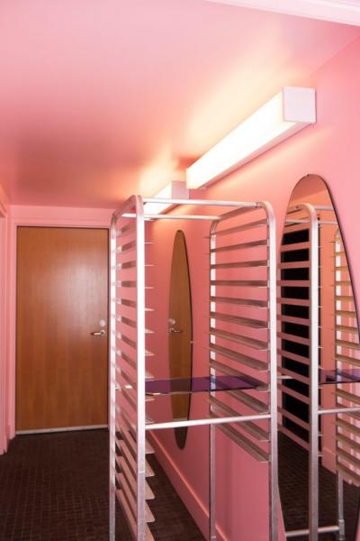 Τα τοξωτά σχήματα αντανακλώνται σε τοιχογραφίες με μπλε και πράσινο μπλοκ, ενώ ο διάδρομος του χώρου είναι βαμμένος εξ’ ολοκλήρου σε ανοιχτό ροζ.