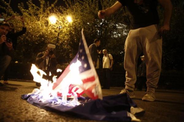 Οργανώσεις της εξωκοινοβουλευτικής αριστεράς, αντιφασιστικές και αντιρατσιστικές συλλογικότητες συγκεντρώθηκαν αρχικά στα προπύλαια του Πανεπιστημίου Αθηνών και στη συνέχεια κατευθύνθηκαν μέχρι το υπουργείο Εξωτερικών, όπου κι έκαψαν ως ένδειξη διαμαρτυρίας μία αμερικάνικη σημαία.