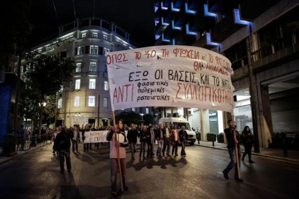 Με κεντρικό σύνθημα «Ποτέ ξανά φασισμός» οι διαδηλωτές καταδίκασαν οποιαδήποτε φασιστική και ρατσιστική συμπεριφορά, καθώς και τις δράσεις της Χρυσής Αυγής.