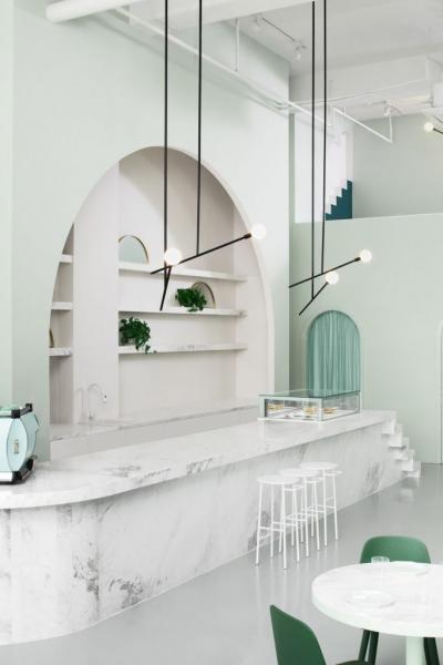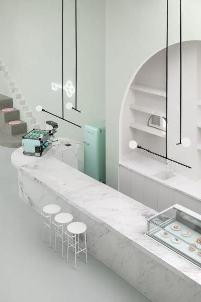 Το στούντιο σχεδιασμού Biasol, από την Μελβούρνη, συνδυάζει μαρμάρινες επιφάνειες με γεωμετρικά σχέδια και παστέλ αποχρώσεις με έμπνευση την ταινία του Wes Anderson, Το Grand Budapest Hotel για αυτό το καφέ στο Chengdu της Κίνας.