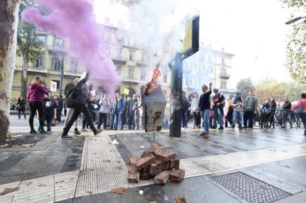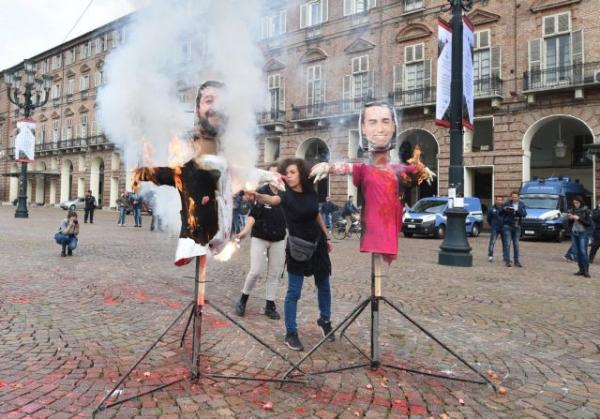 Στο Τορίνο, οι διαδηλωτές έκαψαν δυο ομοιώματα με τις φωτογραφίες του γραμματέα της Λέγκα, Ματέο Σαλβίνι και του αρχηγού των Πέντε Αστέρων, Λουίτζι Ντι Μάιο.