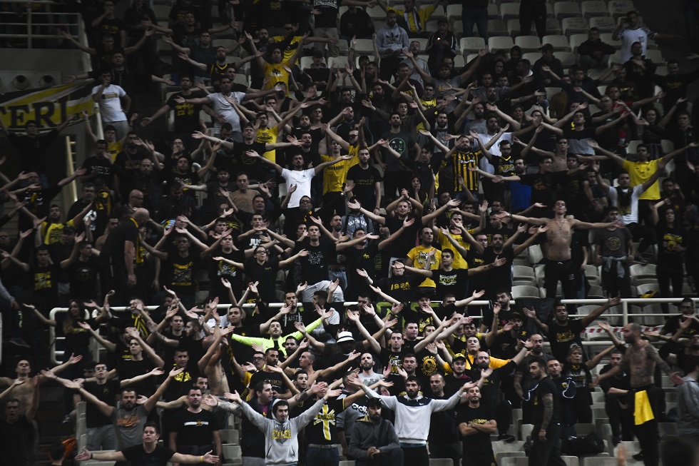 Συνθήματα κατά του ΠΑΟΚ φωνάζουν συνεχώς οι φίλοι της ΑΕΚ στο κλειστό του ΟΑΚΑ για όσα έγιναν πέρυσι στην Τούμπα αλλά και την ποινή αφαίρεσης 3 βαθμών που τους επιβλήθηκε φέτος για τα επεισόδια στο ντέρμπι με τον Ολυμπιακό.