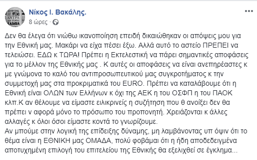 «Δεν θα έλεγα ότι νιώθω ικανοποίηση επειδή δικαιώθηκαν οι απόψεις μου για την Εθνική μας. Μακάρι να είχα πέσει έξω. Αλλά αυτό το αστείο ΠΡΕΠΕΙ να τελειώσει. ΕΔΩ κ ΤΩΡΑ! Πρέπει η Εκτελεστική να πάρει σημαντικές αποφάσεις για το μέλλον της Εθνικής μας. Κ αυτές οι αποφάσεις να είναι ανεπηρέαστες κ με γνώμονα το καλό του αντιπροσωπευτικού μας συγκροτήματος κ την συμμετοχή μας στα προκριματικά του EURO.