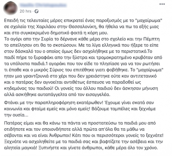 Αφορμή στάθηκε μια ανάρτηση το Facebook ενός γονέα του οποίου η κόρη φοιτά στο ίδιο σχολείο, ότι ο 11χρονος μαθητής από τη Συρία υφίστατο bullying από συμμαθητές του.