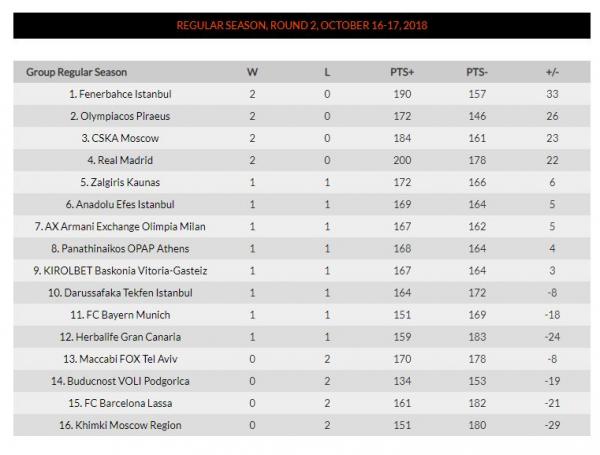Ο Ολυμπιακός επικράτησε εκτός έδρας της Μπασκόνια και διατηρεί μαζί με άλλες τρεις ομάδες το απόλυτο στις δύο πρώτες αγωνιστικές στης Euroleague. Ας ρίξουμε μια ματιά στη βαθμολογία.
