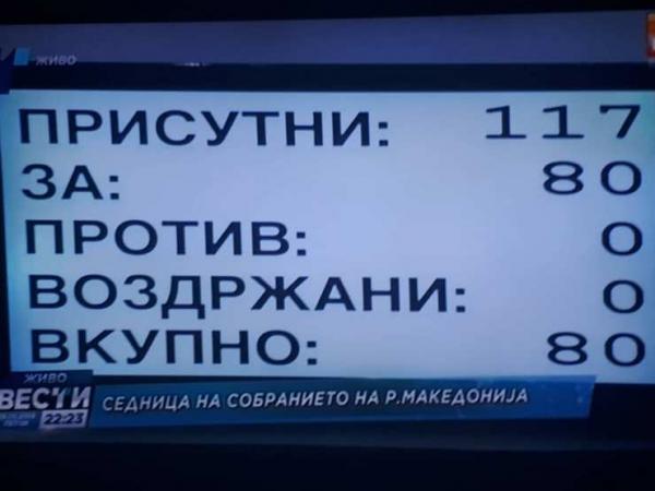 Συνολικά 80 βουλευτές, σε σύνολο 117, ψήφισαν υπέρ της πρότασης Ζάεφ για να προχωρήσει στην αλλαγή της ονομασίας της ΠΓΔΜ σε Δημοκρατία της Βόρειας Μακεδονίας. Αυτό σημαίνει πως την πρόταση υπερψήφισαν και και 8 βουλευτές της αντιπολίτευσης. Με την αλλαγή του ονόματος θα ανοίξει ο δρόμος για την ένταξη της χώρας στο ΝΑΤΟ και την Ευρωπαϊκή Ένωση.