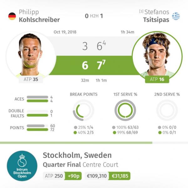 Την πρόκρισή του στα ημιτελικά του τουρνουά που διεξάγεται στην Στοκχόλμη (250αρι) πανηγύρισε την Παρασκευής 19/10 ο Στέφανος Τσιτσιπάς. Ο έλληνας τενίστας ξεδίπλωσε στο κορτ το πλούσιο ταλέντο του και πραγματοποιώντας μία ακόμα εξαιρετική εμφάνιση επικράτησε με 2-0 σετ (6-3, 7-6 [4]) του πολύπειρου, Φιλίπ Κολσράιμπερ.