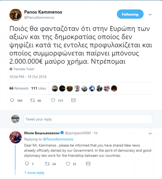 «Αγαπητέ κ. Καμμένε, πρέπει να γνωρίζετε ότι διακινείτε fake news, τα οποία έχουν ήδη διαψευσθεί από την κυβέρνησή μας. Στο πνεύμα της δημοκρατίας και των καλών διπλωματικών σχέσεων, ας εργασθούμε για την φιλία μεταξύ των δύο χωρών μας» αναφέρει το απαντητικό tweet του κυβερνητικού εκπροσώπου της ΠΓΔΜ.