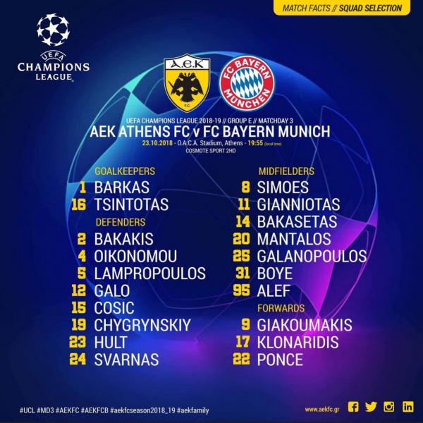 Με τον Λούκας Mπογέ για πρώτη φορά σε αποστολή αγώνα Champions League, ανακοίνωσε ο Μαρίνος Ουζουνίδης τους παίκτες του για τον αυριανό (19:55) αγώνα της ΑΕΚ με την Μπάγερν Μονάχου στο ΟΑΚΑ, στο πλαίσιο της 3ης αγωνιστικής των ομίλων.