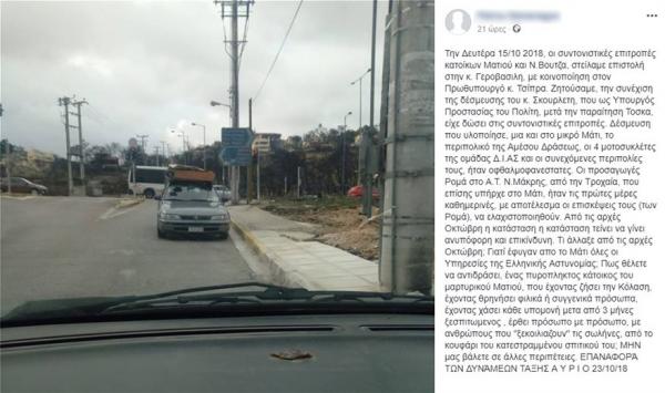 «Την Δευτέρα 15/10 2018, οι συντονιστικές επιτροπές κατοίκων Ματιού και Ν.Βουτζα, στείλαμε επιστολή στην κ. Γεροβασιλη, με κοινοποίηση στον Πρωθυπουργό κ. Τσίπρα. Ζητούσαμε, την συνέχιση της δέσμευσης του κ. Σκουρλετη, που ως Υπουργός Προστασίας του Πολίτη, μετά την παραίτηση Τοσκα, είχε δώσει στις συντονιστικές επιτροπές. Δέσμευση που υλοποίησε, μια και στο μικρό Μάτι, το περιπολικό της Αμέσου Δράσεως, οι 4 μοτοσυκλέτες της ομάδας Δ.Ι.ΑΣ και οι συνεχόμενες περιπολίες τους, ήταν οφθαλμοφανεστατες.