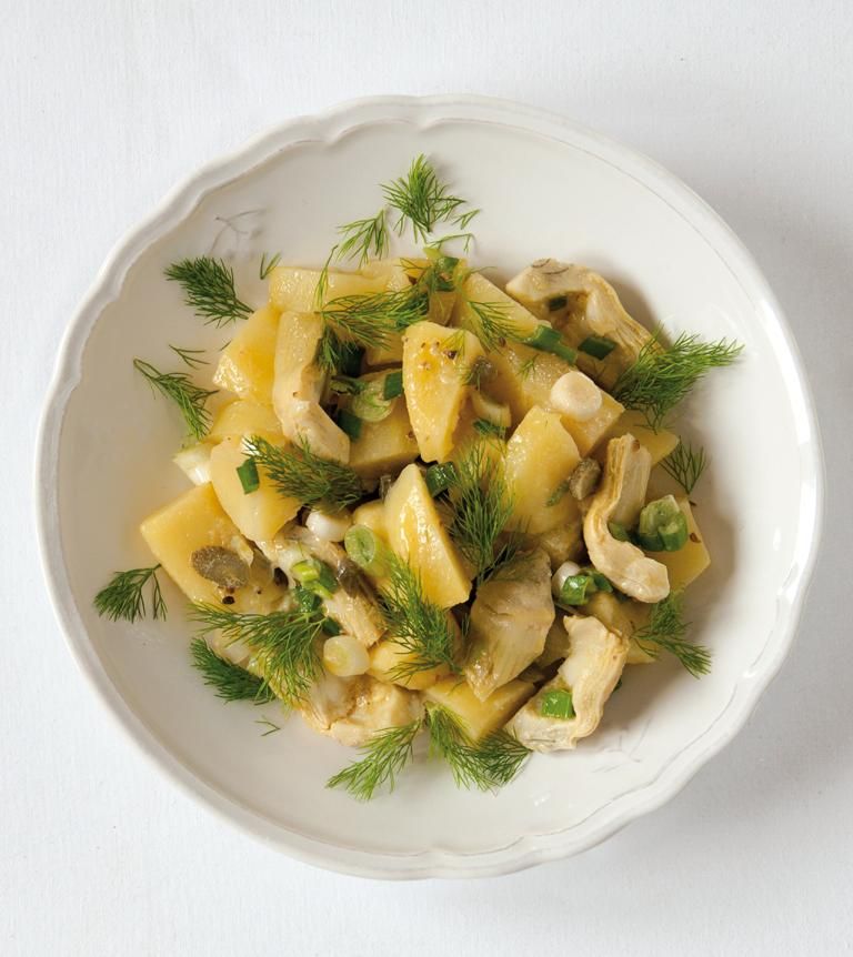 Ξεφλουδίζουµε τις πατάτες όσο είναι ακόµη ζεστές, τις κόβουµε σε κύβους, τις βάζουµε σε σαλατιέρα και τις περιχύνουµε µε τη µισή ποσότητα βινεγκρέτ. Προσθέτουµε τις αγκινάρες, τα αγγουράκια κάππαρης και το φρέσκο κρεµµύδι. Περιχύνουµε µε την υπόλοιπη βινεγκρέτ και ανακατεύουµε καλά. Λίγο προτού σερβίρουµε, µαδάµε πάνω από τη σαλάτα τον µάραθο.