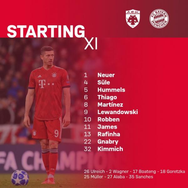 Η αήττητη μέχρι στιγμής στον όμιλο Μπάγερν Μονάχου κοντράρεται με την ΑΕΚ στο ΟΑΚΑ στο πλαίσιο της τρίτης αγωνιστικής των ομίλων του Champions League (19:55). Παρακάτω οι εκλεκτοί του Νίκο Κόβατς.