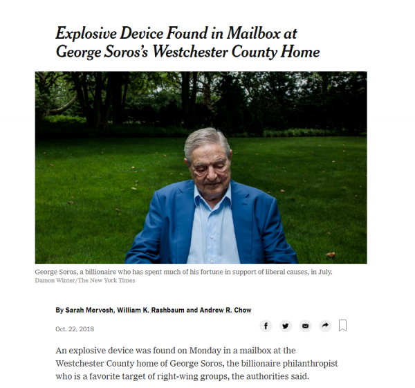 Εκρηκτικός μηχανισμός εντοπίστηκε στο γραμματοκιβώτιο έξω από το σπίτι του Τζορτζ Σόρος στη Νέα Υόρκη, σύμφωνα με ανακοίνωση της τοπικής αστυνομίας.