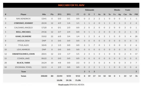 Η Μακάμπι είχε μόνο τον Κέιν στην επίθεση, ο Ολυμπιακός παρουσίασε πολυφωνία (5 παίκτες με διψήφιο αριθμό πόντων) και έτσι επέστρεψε στα θετικά αποτελέσματα πριν τα δύο εκτός έδρας παιχνίδι με την ΤΣΣΚΑ Μόσχας και τον Παναθηναϊκό. Πρώτος σκόρερ των Πειραιωτών ο Βασίλης Σπανούλης με 16 πόντους και 5 ασίστ, τον ακολούθησε ο Τουπάν με 15 πόντους και 4/5 τρίποντα, ενώ ο Γκος είχε 14, ο Πρίντεζης 13 και ο ΛεΝτέι 13.