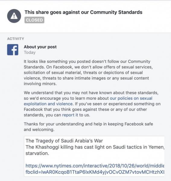 Σάλο έχει προκαλέσει τις τελευταίες ώρες η είδηση ότι το Facebook διέγραφε τις αναρτήσεις αναγνωστών που είχαν προσπαθήσει να αναδημοσιεύσουν στα προφίλ τους το άρθρο των New York Times σχετικά με τις πολεμικές συγκρούσεις και την πείνα στην Υεμένη