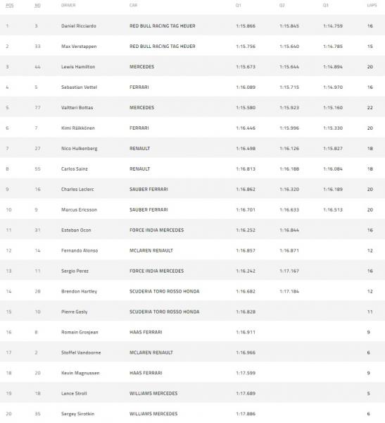 Η Red Bull επιβεβαίωσε την ανωτερότητά της, με τους Ρικιάρντο και Φερστάπεν να εναλλάσσονται στην κορυφή. Τελικά, αυτός που χαμογέλασε τελευταίος ήταν ο Ρικιάρντο, με τον Αυστραλό πιλότο να κατακτά την pole position με 1:14:759 και τον team mate του να ολοκληρώνει την προσπάθειά του με 1:14:785. Ο Χάμιλτον δεν κατάφερε να κοντράρει τα μονοθέσια της Red Bull, αλλά λίγη σημασία έχει, καθώς αν στο αυριανό Grand Prix τερματίσει από την 7η θέση και πάνω θα κατακτήσει το πρωτάθλημα για το 2018!