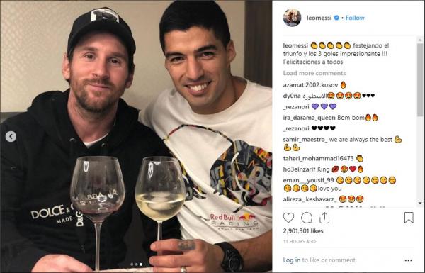 Λιονέλ Μέσι και Λουίς Σουάρες γιόρτασαν την πεντάρα επί της Ρεάλ με ένα ποτήρι κρασί.