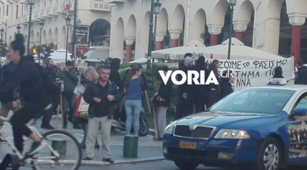Παράλληλα, μέλη του αντιεξουσιαστικού χώρου πραγματοποιούν αντισυγκέντρωση στη συμβολή των οδών Αριστοτέλους με Τσιμισκή. Οι αντιεξουσιαστές ανήρτησαν πανό κατά του φασισμού και πέταξαν φυλλάδια.