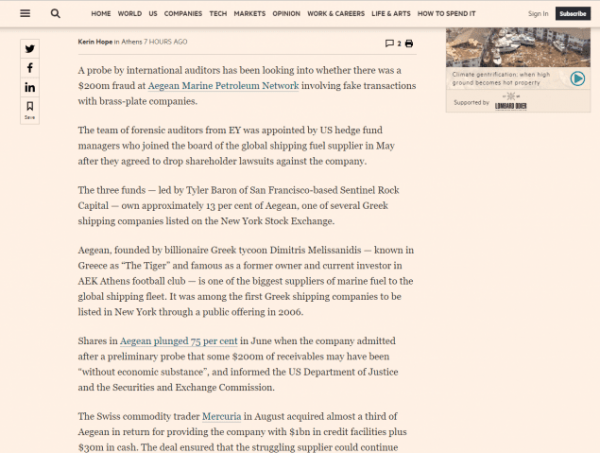 FT: Ελεγκτές ερευνούν πιθανή απάτη 200 εκατ. δολ. στην Aegean Marine