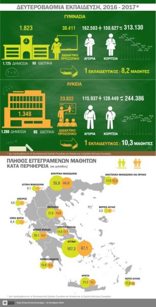 α) Οι σχολικές μονάδες κατά το σχολικό έτος 2016-2017, σε σχέση με το 2015-2016, παρουσίασαν αύξηση στα Γυμνάσια από 1.819 σε 1.823 και στα Λύκεια από 1.333 σε 1.348. β) Το διδακτικό προσωπικό κατά το σχολικό έτος 2016-2017, σε σχέση με το 2015-2016, μειώθηκε από 38.929 σε 38.411 άτομα στα Γυμνάσια και αυξήθηκε από 23.805 σε 23.822 άτομα στα Λύκεια. γ) Οι εγγεγραμμένοι μαθητές κατά το σχολικό έτος 2016-2017, σε σχέση με το 2015-2016, παρουσίασαν αύξηση από 311.236 σε 313.130 στα Γυμνάσια και από 240.852 σε 244.386 στα Λύκεια. δ) Οι αποφοιτήσαντες μαθητές κατά το σχολικό έτος 2016-2017, σε σχέση με το 2015-2016, παρουσίασαν αύξηση από 99.820 σε 100.980 στα Γυμνάσια και από 75.995 σε 76.900 στα Λύκεια. ε) Η αναλογία του διδακτικού προσωπικού προς τους μαθητές για το σχολικό έτος 2016-2017 ήταν 1 εκπαιδευτικός για 8,2 μαθητές στα Γυμνάσια και 1 εκπαιδευτικός για 10,3 μαθητές στα Λύκεια, ενώ για το σχολικό έτος 2015-2016 οι αντίστοιχες αναλογίες ήταν 1 προς 8,0 και 1 προς 10,1. στ) Η περιφέρεια Αττικής συγκέντρωσε το 34,3% του σχολικού πληθυσμού των Γυμνασίων και το 35,7% του σχολικού πληθυσμού των Λυκείων της Ελλάδας.