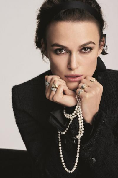 Η Κίρα Νάϊτλι κοιτάζει το φακό με έντονο βλέμμα. Διαφημίζει το Coco Crush ring και το μπρασελέ σε δύο χρώματα του χρυσού. Η διάσημη ηθοποιός «προμοτάρει» και ένα από τα πλέον δημοφιλή αρώματα του εμβληματικού οίκο