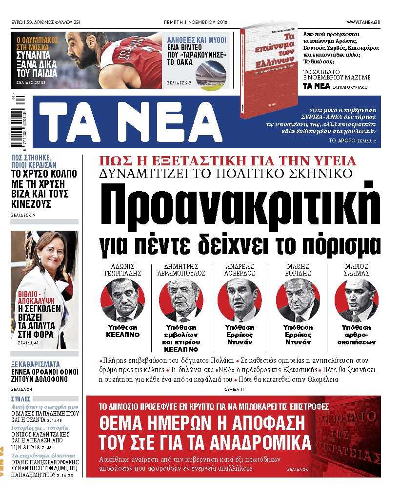 Διαβάστε στα «Νέα» της Πέμπτης: «Προανακριτική για πέντε δείχνει το πόρισμα για την Υγεία