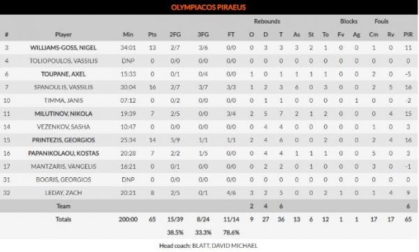 Με μια απίστευτη άμυνα που κατέστρεψε κάθε επιθετικό πλάνο του Δημήτρη Ιτούδη έδωσε τη δυνατότητα στον Ολυμπιακό να κυριαρχήσει. Αρκεί να δει κανείς ότι στα πρώτα 5,30 λεπτά οι γηπεδούχοι είχαν πετύχει μόλις 4π. (4-10), ενώ έκλεισε την πρώτη περίοδο με μόλις 13 πόντους ενεργητικό!