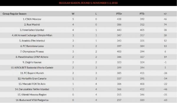 Η ΤΣΣΚΑ Μόσχας, που νίκησε τον Ολυμπιακό 69-65, πέτυχε το 5 στα 5 στη διοργάνωση και αναμένει το αποτέλεσμα του αγώνα της Ρέαλ Μαδρίτης στο Κάουνας (κόντρα στη Ζαλγίρις την Παρασκευή 2/11) για να δει αν θα έχει συγκάτοικο στην κορυφή. Οι Ερυθρόλευκοι από την άλλη έχουν πλέον επίδοση 3-2.