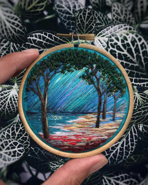 Κάθε κλωστοϋφαντουργική σκηνή αποδίδεται χρησιμοποιώντας μια ποικιλία βελονιών, με αποτέλεσμα σχέδια για κέντημα που μοιάζουν με πολύχρωμα τοπία ζωγραφικής. Τα λιβάδια, τα βουνά και η θέα στον ωκεανό είναι όμορφα διακοσμημένα με το χέρι και πλαισιωμένα από στεφάνια κεντήματος, με αποτέλεσμα αυτούς τους μικρούς κόσμους που μπορείτε να κρατήσετε στην παλάμη του χεριού σας. Τα ροζ ηλιοβασιλέματα, οι ηλιακές ακτίνες και οι περιστρεφόμενοι θυελλώδεις ουρανίσκοι απεικονίζονται με μυριάδες πολύχρωμες βελονιές και βαμβακερές μπάλες από μαλλί.