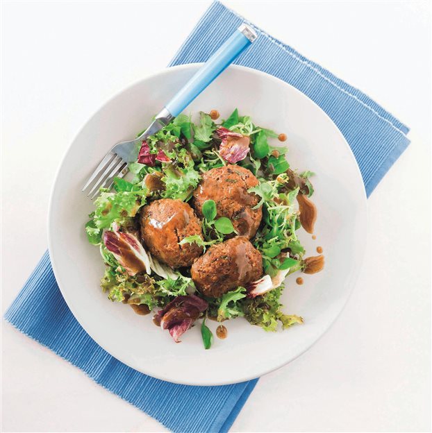 Πλάθουμε μπιφτέκια, τα οποία ψήνουμε στον φούρνο, στους 220°C, για περίπου 20 λεπτά. Σερβίρουμε με μια σαλάτα της επιλογής μας.