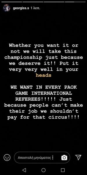 Συγκεκριμένα, έγραψε: «Είτε το θέλετε είτε όχι θα πάρουμε το πρωτάθλημα έτσι απλά γιατί το αξίζουμε! Βάλτε πολύ πολύ καλά στο μυαλό σας… Θέλουμε σε κάθε παιχνίδι του ΠΑΟΚ διεθνείς διαιτητές. Γιατί πολύ απλά ορισμένοι άνθρωποι δεν μπορούν να κάνουν σωστά την δουλειά τους, δεν πληρώνουμε γι΄αυτό το τσίρκο».
