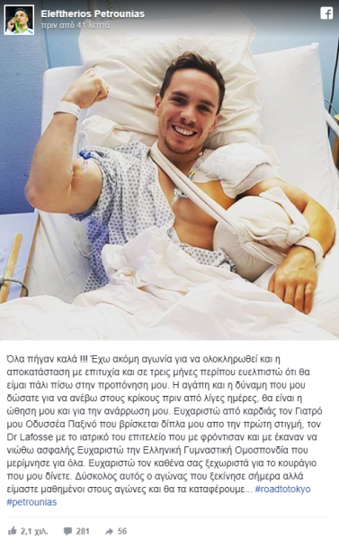 «Όλα πήγαν καλά !!! Έχω ακόμη αγωνία για να ολοκληρωθεί και η αποκατάσταση με επιτυχία και σε τρεις μήνες περίπου ευελπιστώ ότι θα είμαι πάλι πίσω στην προπόνηση μου. Η αγάπη και η δύναμη που μου δώσατε για να ανέβω στους κρίκους πριν από λίγες ημέρες, θα είναι η ώθηση μου και για την ανάρρωση μου. Ευχαριστώ από καρδιάς τον Γιατρό μου Οδυσσέα Παξινό που βρίσκεται δίπλα μου απο την πρώτη στιγμή, τον Dr Lafosse με το ιατρικό του επιτελείο που με φρόντισαν και με έκαναν να νιώθω ασφαλής.Ευχαριστώ την Ελληνική Γυμναστική Ομοσπονδία που μερίμνησε για όλα. Ευχαριστώ τον καθένα σας ξεχωριστά για το κουράγιο που μου δίνετε. Δύσκολος αυτός ο αγώνας που ξεκίνησε σήμερα αλλά είμαστε μαθημένοι στους αγώνες και θα τα καταφέρουμε…»
