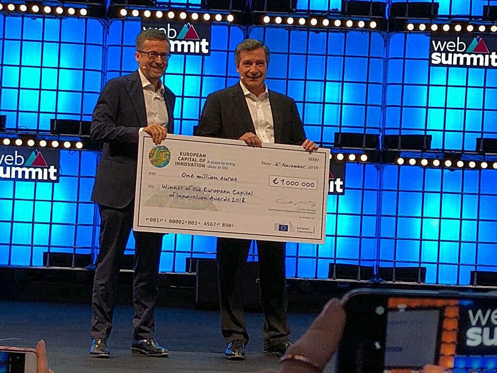 Κατά την παραλαβή του βραβείου και μιλώντας ενώπιον 20.000 συνέδρων ο κ. Καμίνης τόνισε ότι «αποτελεί μία τεράστια αναγνώριση της μεγάλης μας προσπάθειας να κάνουμε τα πράγματα διαφορετικά. Αυτό το διαφορετικό είναι που επιβραβεύεται σήμερα. Ο διαφορετικός τρόπος που επιλέξαμε να αντιμετωπίσουμε τα μεγάλα ζητήματα της πόλης μας και να γίνουμε το παράδειγμα και για άλλες ευρωπαϊκές πόλεις, που – όπως κι εμείς – βρίσκονται αντιμέτωπες με δυσκολίες κοινωνικές, οικονομικές, ηθικές. Μάθαμε να ξεπερνάμε τα εμπόδια μέσα από τη συνεργασία. Γίναμε καλύτεροι μέσα από την κοινή προσπάθεια. Σπάσαμε στεγανά και ήρθαμε κοντά. Πολίτες, πανεπιστήμια, ιδιωτικά ιδρύματα, εταιρίες, μη κυβερνητικές οργανώσεις, δημοτικές υπηρεσίες και αιρετοί εκπρόσωποι, δημιουργήσαμε μαζί ένα νέο σύνολο ποικίλλων οικοσυστημάτων. Μια νέα πόλη στην οποία οι άνθρωποι θέλουν να ανήκουν. Με τον δήμο σε ρόλο περήφανου μαέστρου, που βλέπει την ταλαντούχα ομάδα του να δημιουργεί και να διαπρέπει. Αποδείξαμε ότι η καινοτομία είναι κουλτούρα και μας επιτρέπει να κάνουμε πολύ περισσότερα με λιγότερα».
